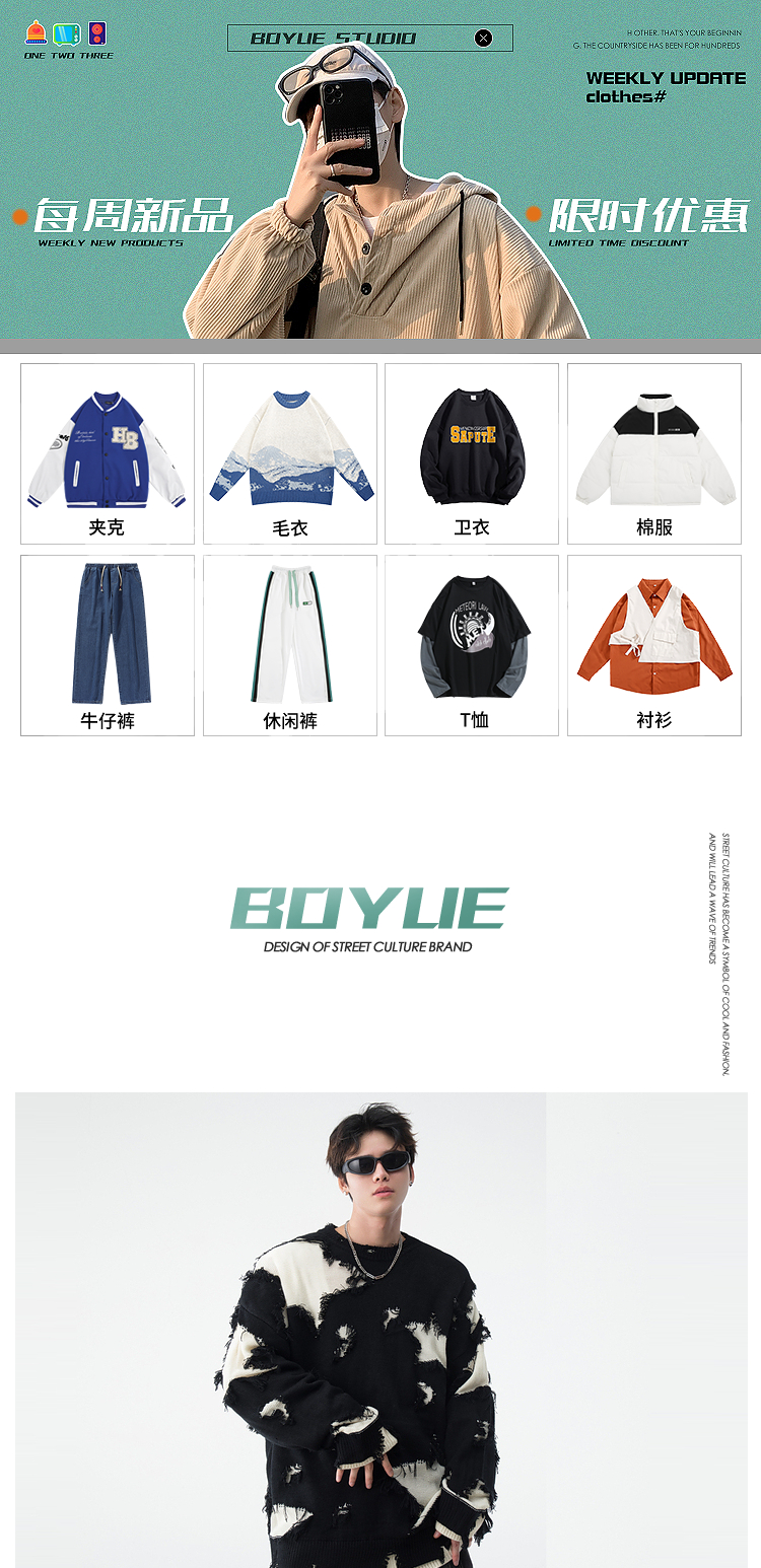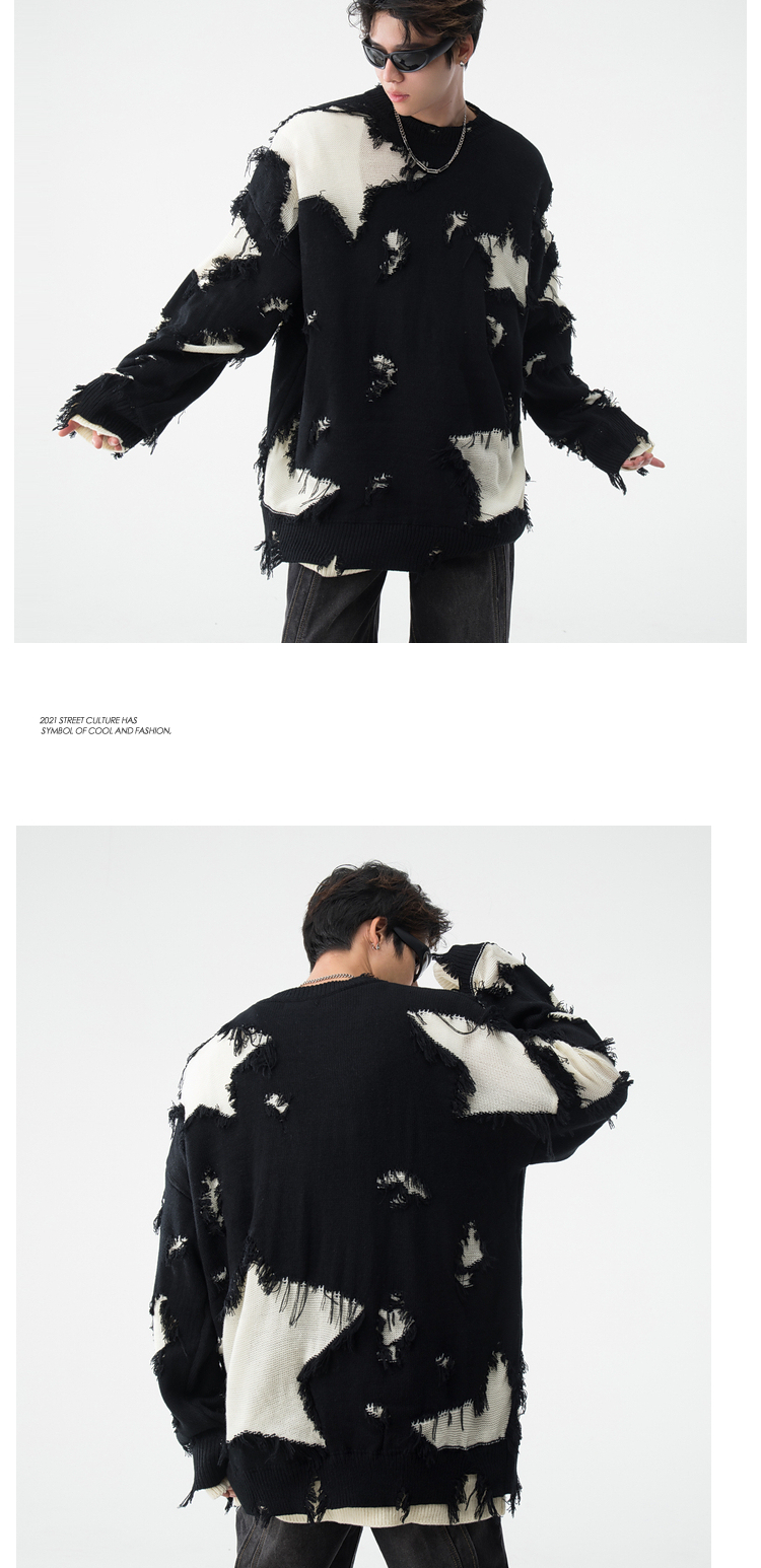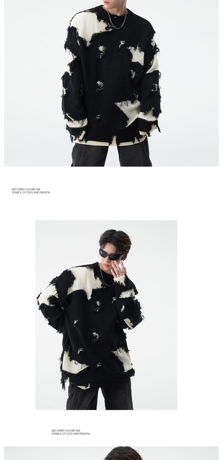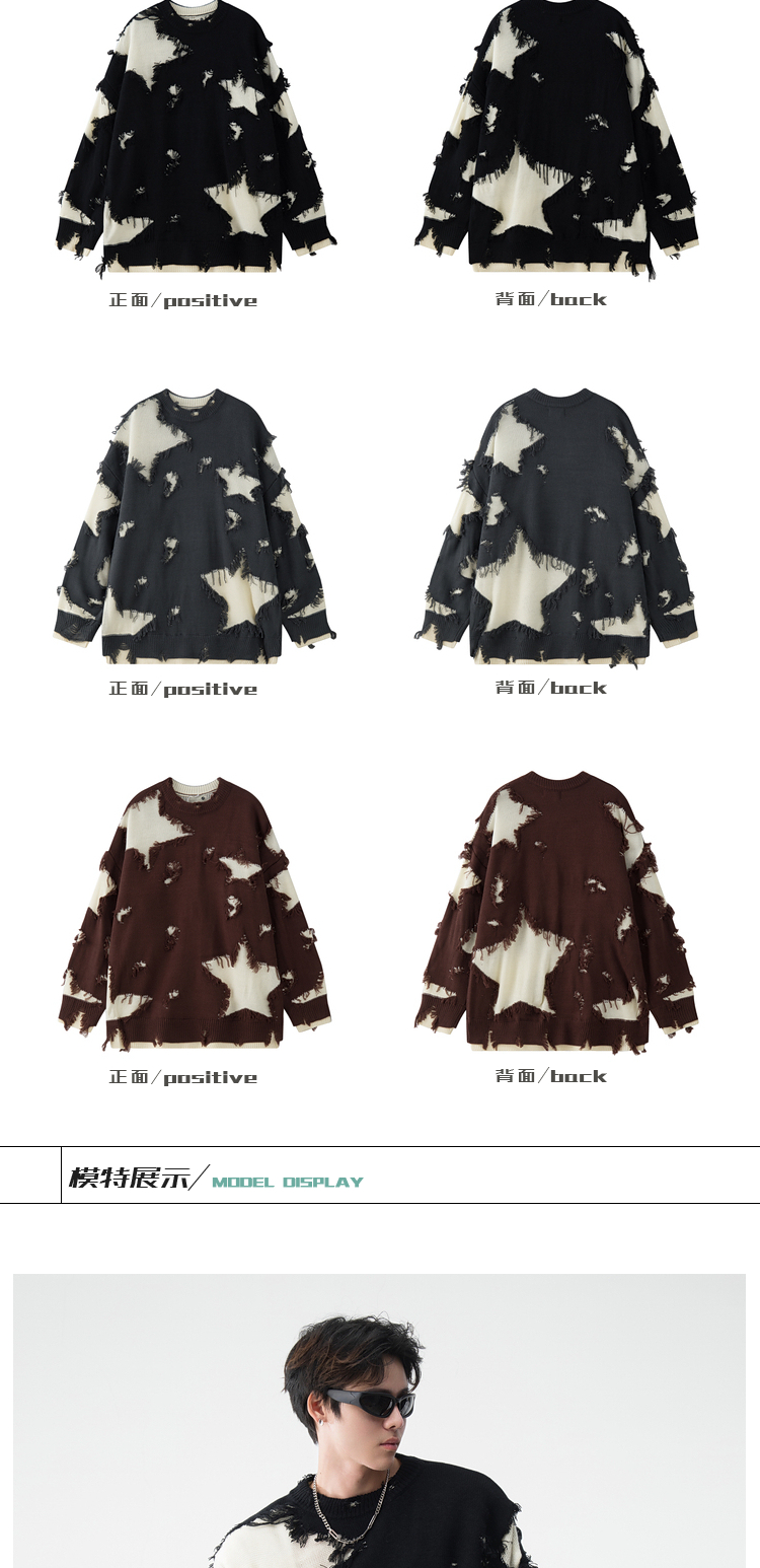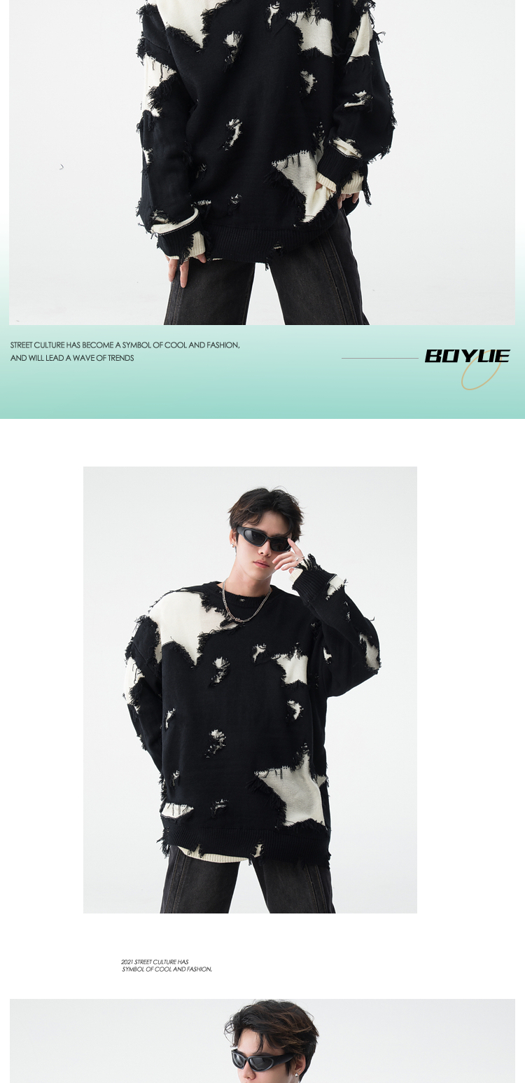 BOYUE帛跃星星破洞毛衣美式小众毛边破烂风男女时尚重工针织衫潮
